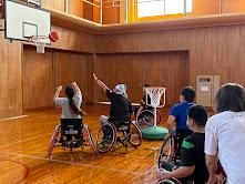 はじめにラジオ体操をしてから、車いす操作やドリブル、下に落ちたボールの拾い方を説明し、シュート練習、リレーゲーム、交流試合をして楽しみました。