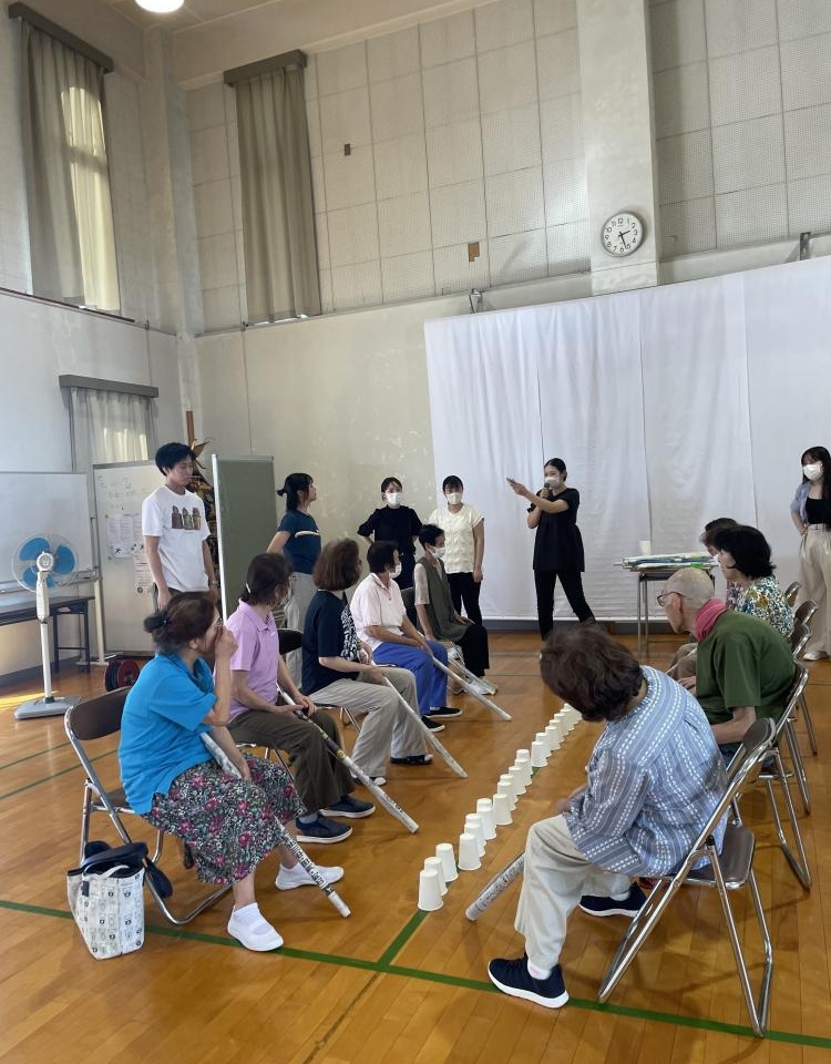 写真は9月26日(金)三ケコミュニティーセンターで行われている100歳体操に参加した様子です。看護師資格を持つ学生は、体操前に健康チェック、紙コップホッケーを企画・実施しました。
