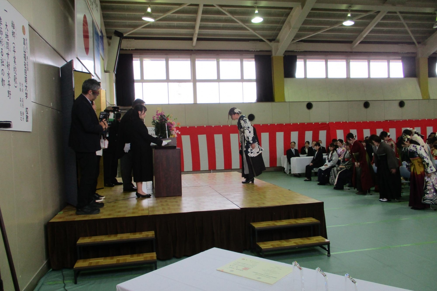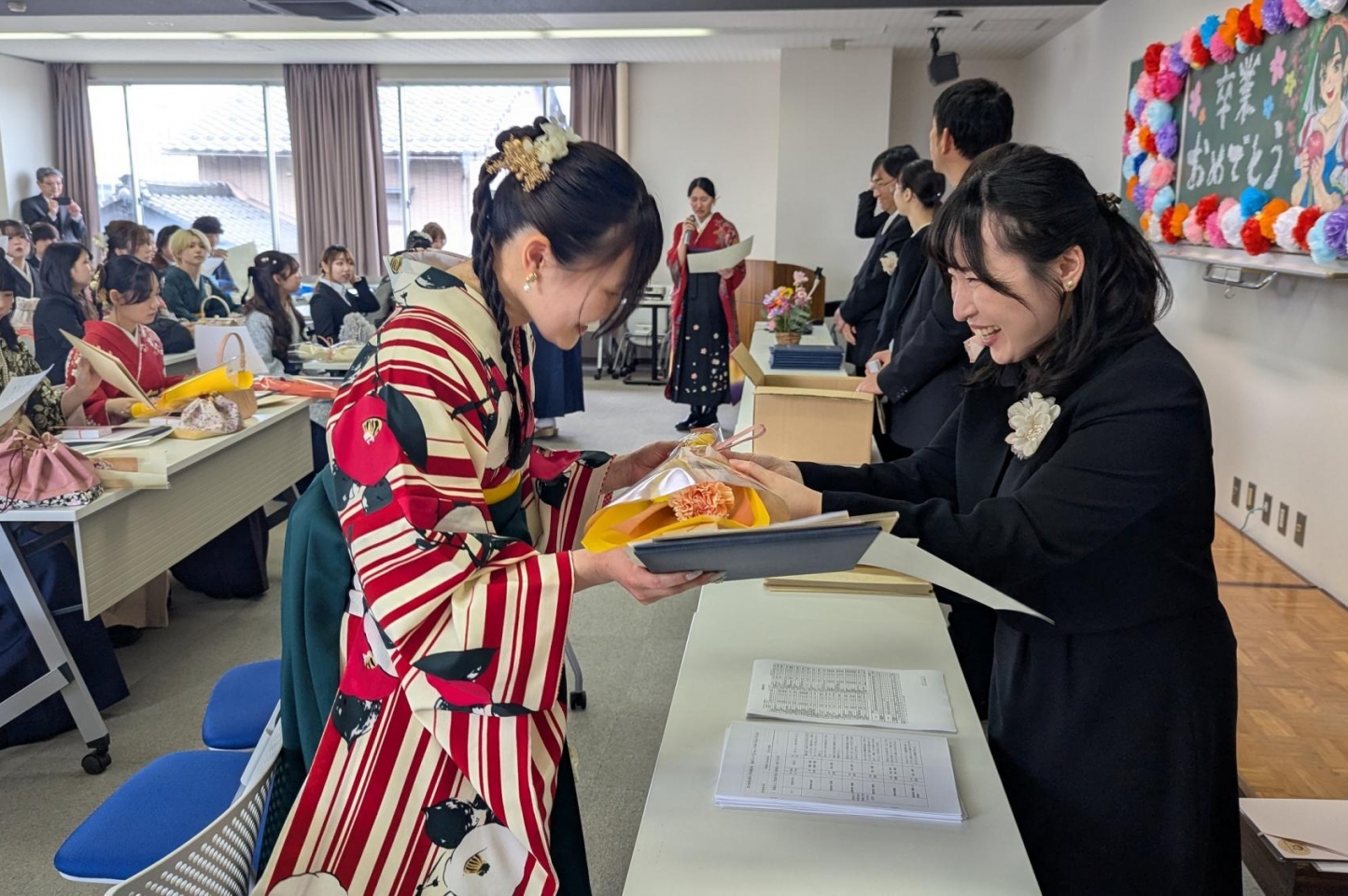 式終了後には、各学科に分かれ、一人ひとりに卒業証書、修了証書が手渡されました。