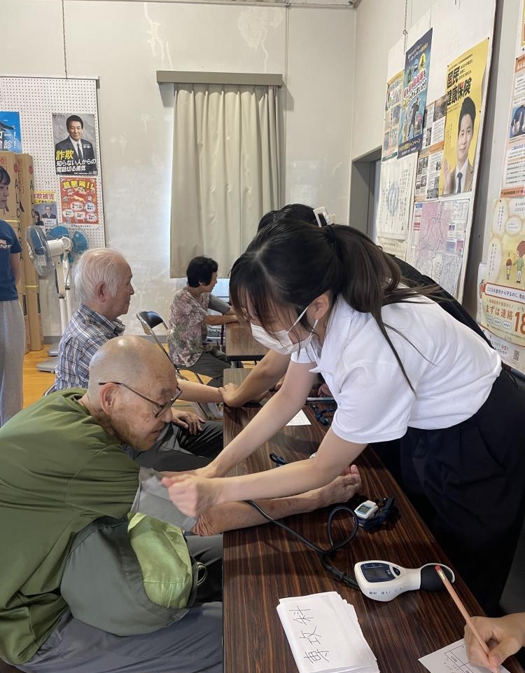 参加した高齢者の方は、笑顔で「また来てね」「血圧は高くないよ」「私いくつに見える?」等と学生に話されました。